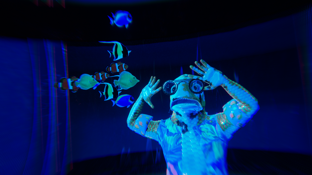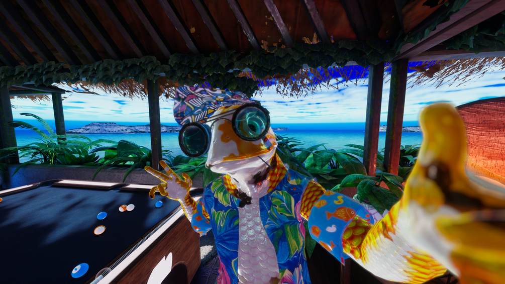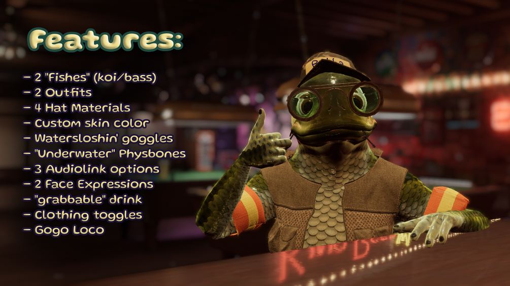 He also has toggleable audiolink on his scales, clothes, and caustics, and "underwater" physbones for all his fins, his "floppy" physbone flipflops are also fun to walk in. I'm proud of the special animated Caustics I made to react to the music, really sells the underwater look imo.
