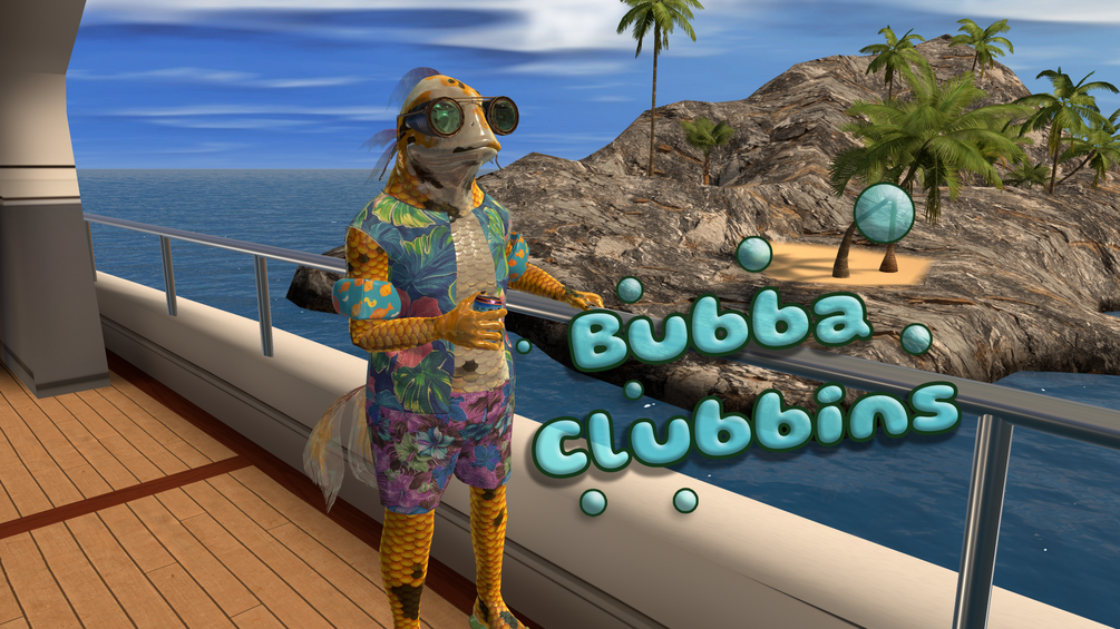 Bubba Clubbins, a summer-loving party Koi Fish. I thought it would be funny if I made fish that couldn't swim, so he has lil arm floaties, and sloshing water in his goggles to keep his eyes wet.