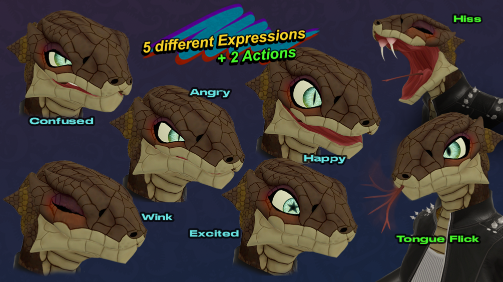 This VR Chat ready avatar has expressions‚ fun eye shapes‚ visemes‚ and customizable scale colors‚ customizable clothes, and she even flicks her tongue sometimes. She also has customizable Audiolink on the scales/clothes‚ wigglable toes, jacket‚ and skirt‚ AND a "hiss" button so you can smell with your tongue just like a cold blooded reptile would.