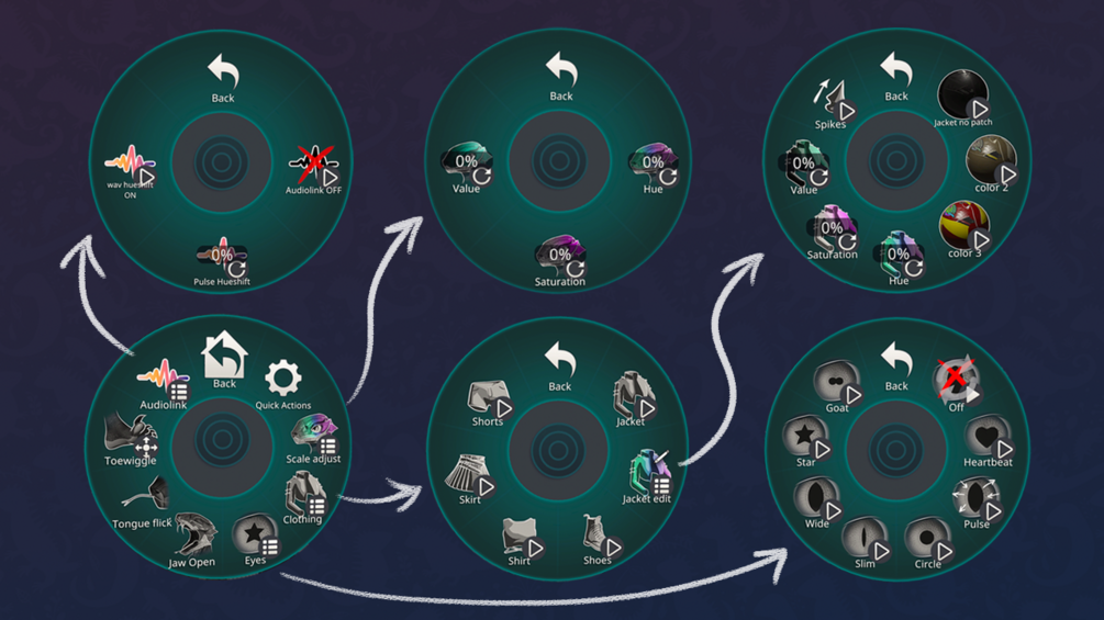 All custom options are set up via radial menus in your VRC expressions, so no need to do complex photoshop/substance work to customize Lizzy! (but of course you're welcome if you so choose)